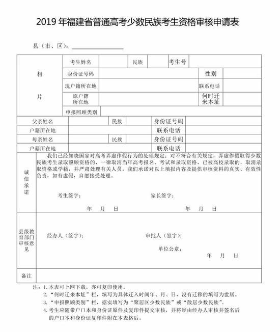 符合条件的考生须于2019年5月8日-10日,向本人高考报名现场确认点所在县(市、区)教育招生考试机构提出申请。逾期不予受理。申报时,考生须按照《福建省普通高考录取照顾资格考生申报须知》(以下简称《申报须知》)要求,提交《福建省普通高考录取照顾资格考生登记表》(以下简称《登记表》),其中:少数民族考生还须提交《福建省普通高考少数民族考生资格审核申请表》(以下简称《申请表》);考生同时还须提交相关证明材料(含原件和复印件,其中复印件上验证人须签名并加盖公章)。