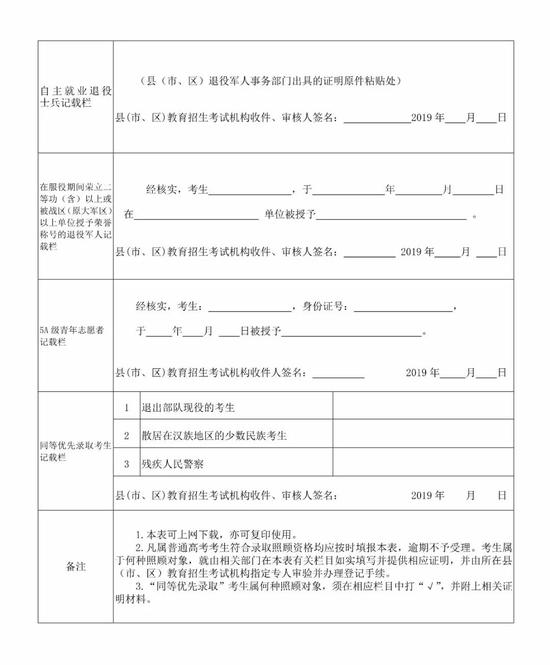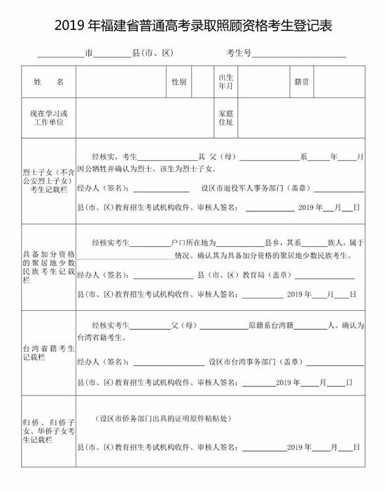 注:考生可自行登录“福建省教育考试院门户网站(www.eeafj.cn)-数字服务大厅-高考高招”下载打印《登记表》和《申请表》,或到当地县级教育招生考试机构领取。