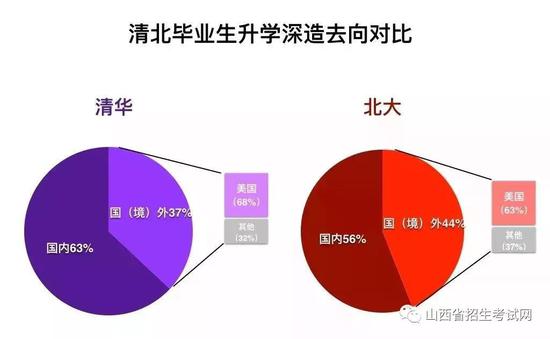 在选择升学的毕业生中,清华有63%留在国内深造,这其中80%以上是留在清华或者去“对门”北大读书;而北大毕业生出国的比例更高,为44%。