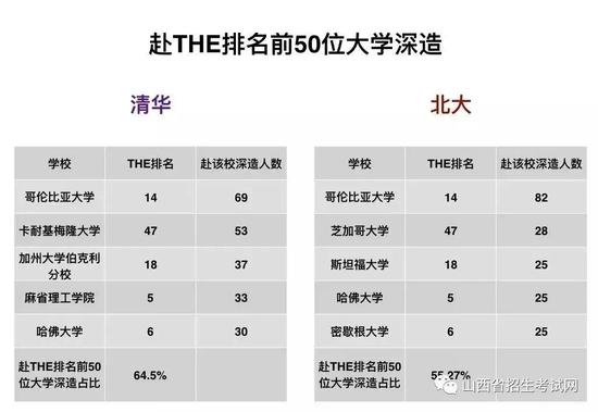 清北毕业生出国读书择校的眼光也都相当高,分别有64.5%和55.3%选择泰晤士排名前50位的高校深造。