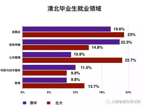 从就业单位行业来看,两校签三方就业毕业生中,分别有74.1%(清华)和84.18%(北大)集中在信息传输、金融业、公共管理、科学研究与技术服务及教育等5大行业。