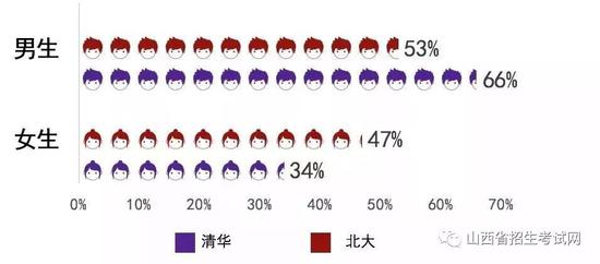 清华2017届毕业生中,男生也更多些,达到66%,而北大的男女生比例更为均衡,男生占比53%,女生占比47%。