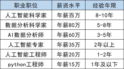 2018年python、大数据、人工智能从业者薪资数据显示,北上广三地的平均薪资水平分别为29036元、25163元和23036元,年薪几十万甚至百万。人工智能是未来的发展方向,国家政策也在强力扶持,可以说学人工智能类专业就相当于捧上了“金饭碗”。