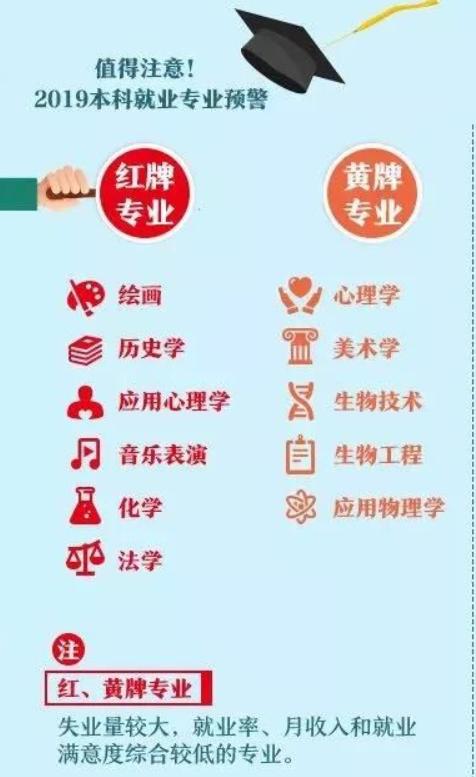 《2019年中国大学生就业报告》显示,2019年本科就业红牌专业包括:绘画历史学、应用心理学音乐表演化学法学。其中,历史学音乐表演法学连续三届被亮红牌。