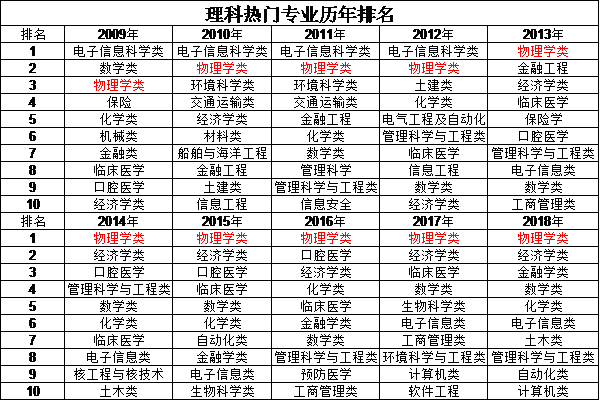 从上表不难看出,红色字体标注的物理学类2013年-2018年6年间霸榜理科热门专业前列,在2009年-2012年间电子信息科学类专业持续位居理科热门专业排行榜榜首,物理学类和电子信息科学类专业是近10年理科生的热门专业大类。