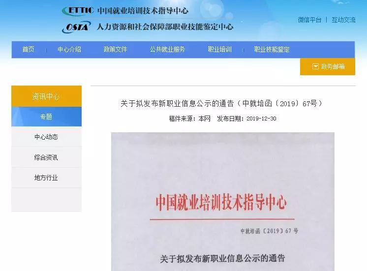 近日,中国就业培训技术指导中心官网发布了《关于拟发布新职业信息公示的通告(中就培函〔2019〕67号)》,《通告》发布了16个新职业相关信息。