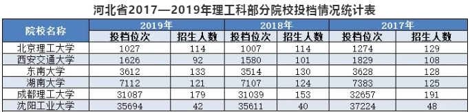 其实不管怎么合并,对于这类院校的影响比较小。因为每年这类学校在河北省的招生计划变化不大,招生人数有限,况且报考热度一直很高。所以,其投档位次一般变化不大,相对稳定(见下表)。其前三年的投档分和投档位次对2020年考生会有一定的参考价值。