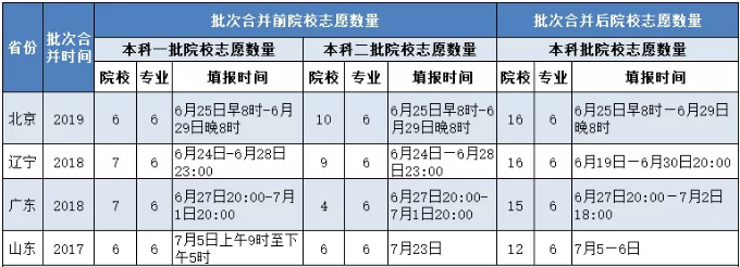 从上表中可以看出,一本和二本已合并批次的省份,其院校志愿的数量都有所增加,基本相当于原来的本一批和本二批的院校志愿数量之和,专业志愿不变。如辽宁省合并之前本科一批可报7个院校志愿,本科二批可报9个院校;合并后可填报16个院校志愿。