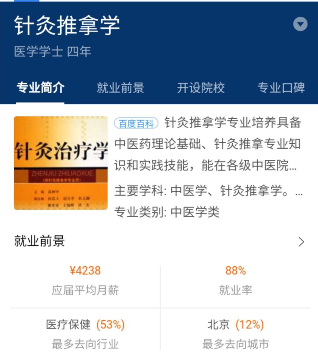 该专业培养的人才既可以在各级中医院及综合性医院从事针灸、推拿医疗等工作,也可在高等院校从事教育教学的工作。根据相关资料显示,医疗保健行业为最多去向行业,就业率高达88%。