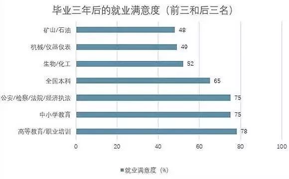 刚开始工作时,高薪水就等于触手可及的幸福,满意度高的往往是高薪的那一批人;工作三年后, 从事“教育”类职业的人明显更乐观,高等教育/职业培训的就业满意度第一(78%),中小学教育就业满意度为75%。