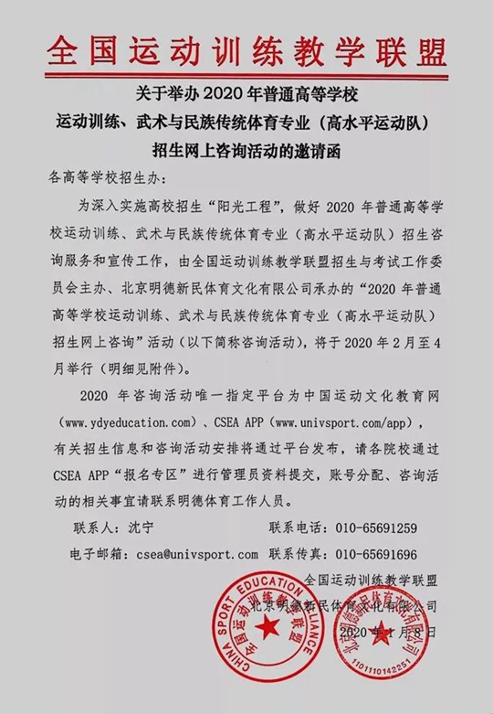 近日,全国运动教学联盟发布了《关于举办2020年普通高等学校运动训练、武术与民族传统体育专业(高水平运动队)招生网上咨询活动的邀请函》。2020年体育单招网络咨询会将分别于2月29日、3月8日在CSEAAPP开展,届时来自153所单招院校招生负责人将在线回复考生的提问,并在线查看考生个人空间的运动成长信息。