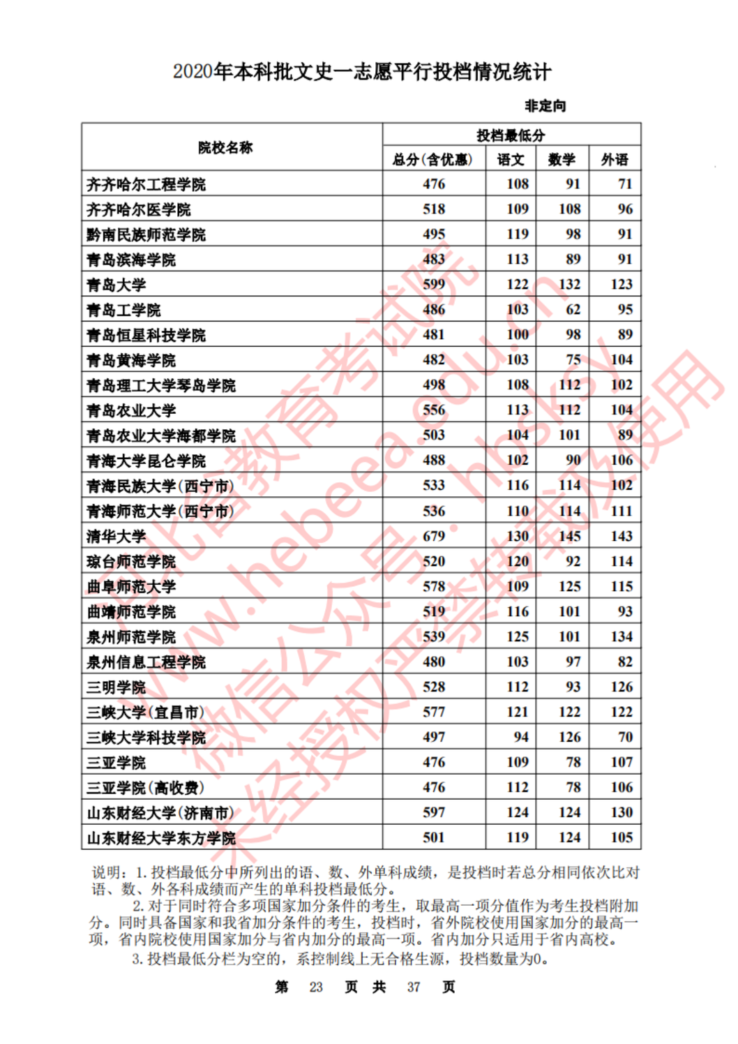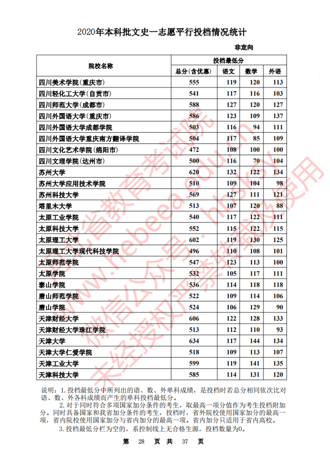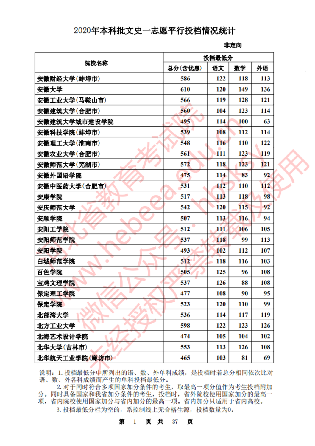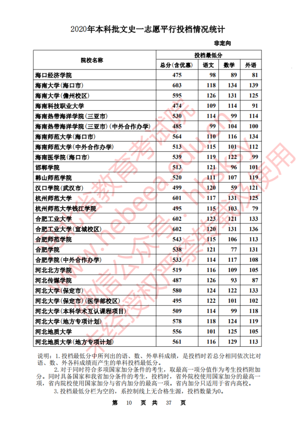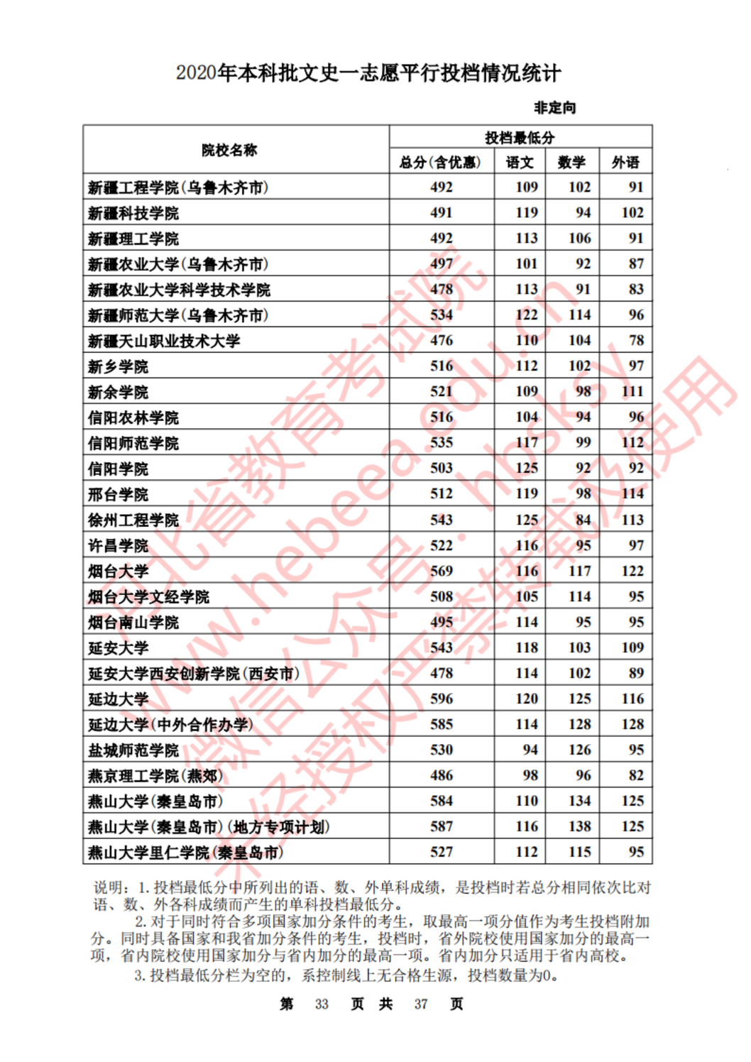 河北:2020年本科批一志愿平行投档情况统计(文史)
