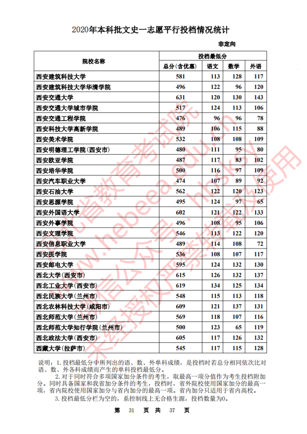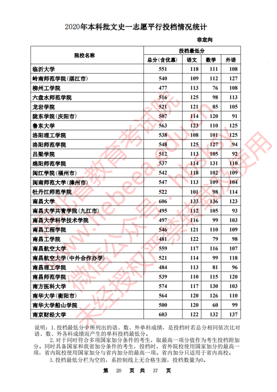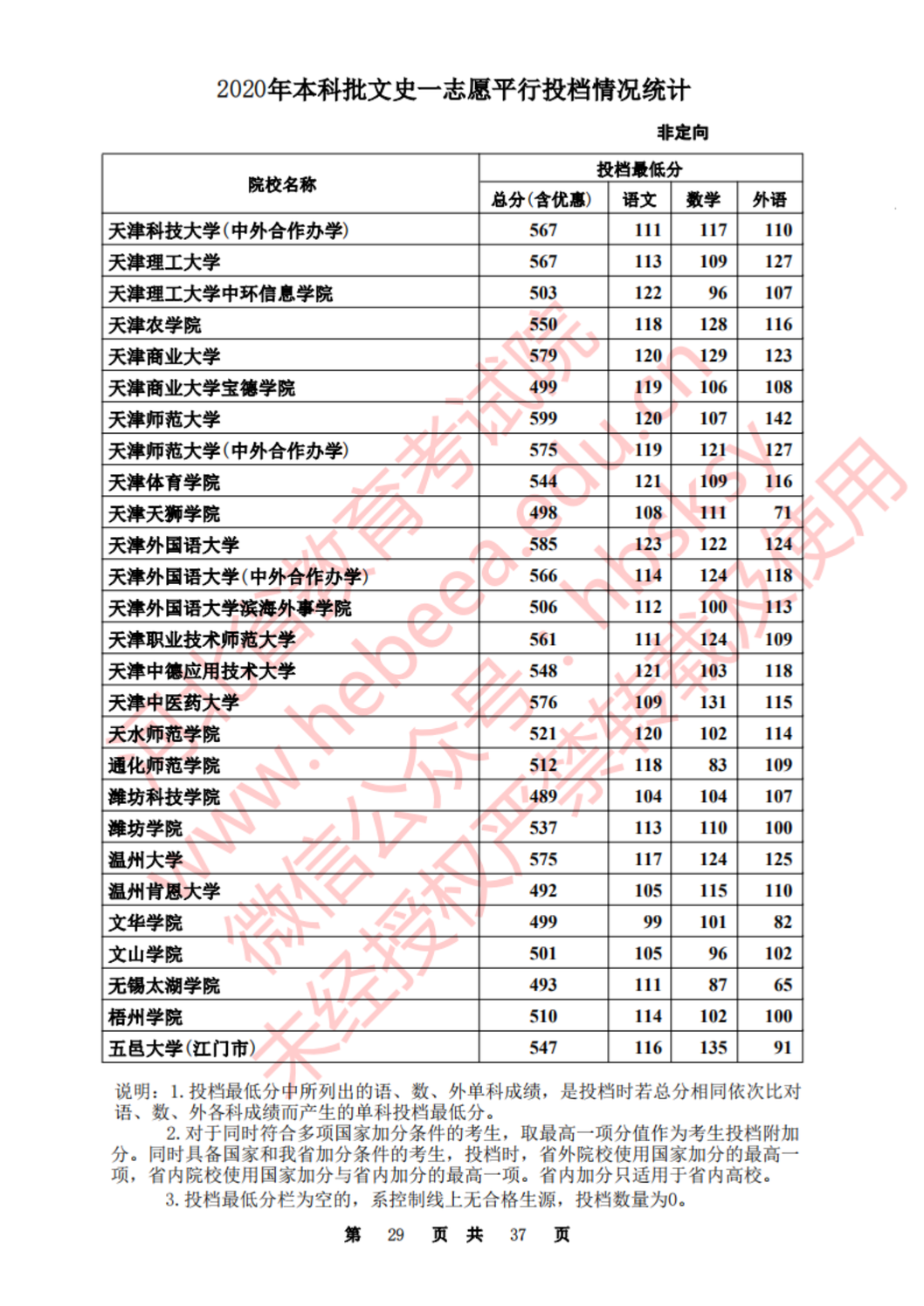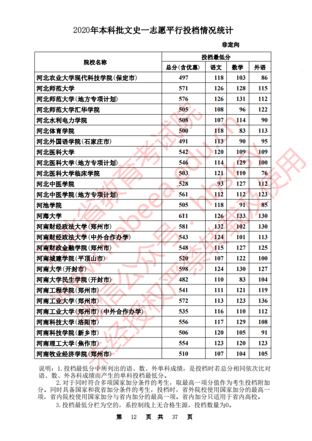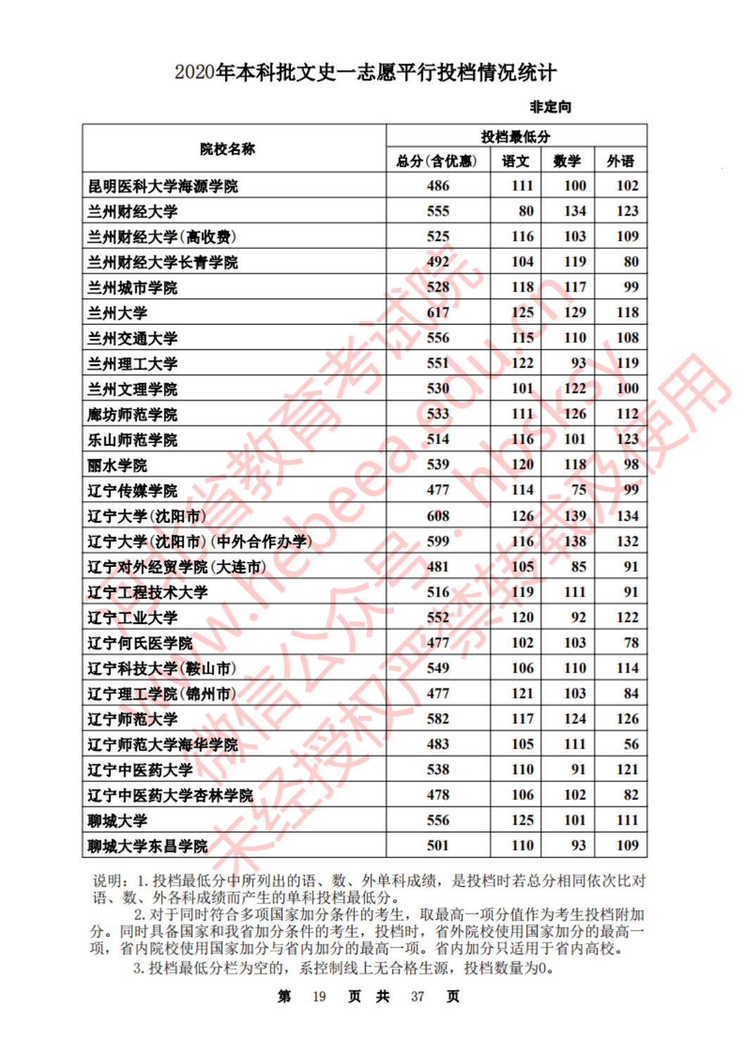 河北:2020年本科批一志愿平行投档情况统计(文史)