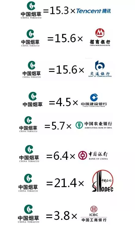 那么中国烟草缴纳的庞大税利数字与各大银行、中石化、腾讯等大头利润比较起来是一个怎样的概念呢?