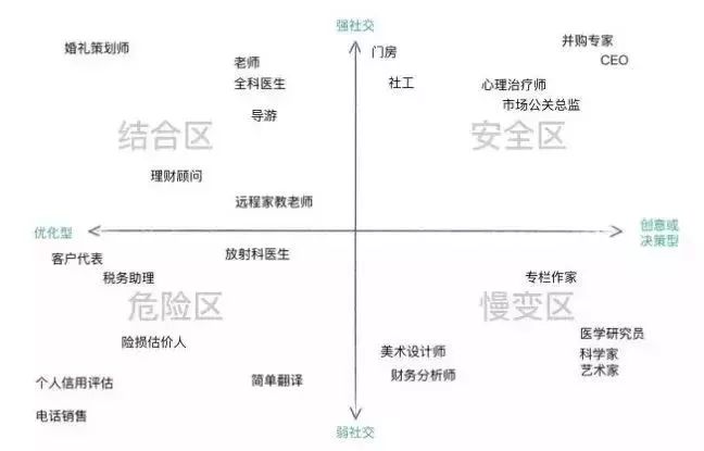 同样的,我们要对认知劳动中的优化型进行了解,如果认知劳动的重点是将数据中可量化的变量最大化,就归类为“优化型”的职业,比如个人信用评估员,他们只需将客户最近的商业行为罗列出来,根据信用评估表一一对应,最终得出信用评分就可以了,所以看出他们所做的工作得出的结果都是可以量化的。而人工智能就是一个善于数据分析将结果量化的一个“行家”。