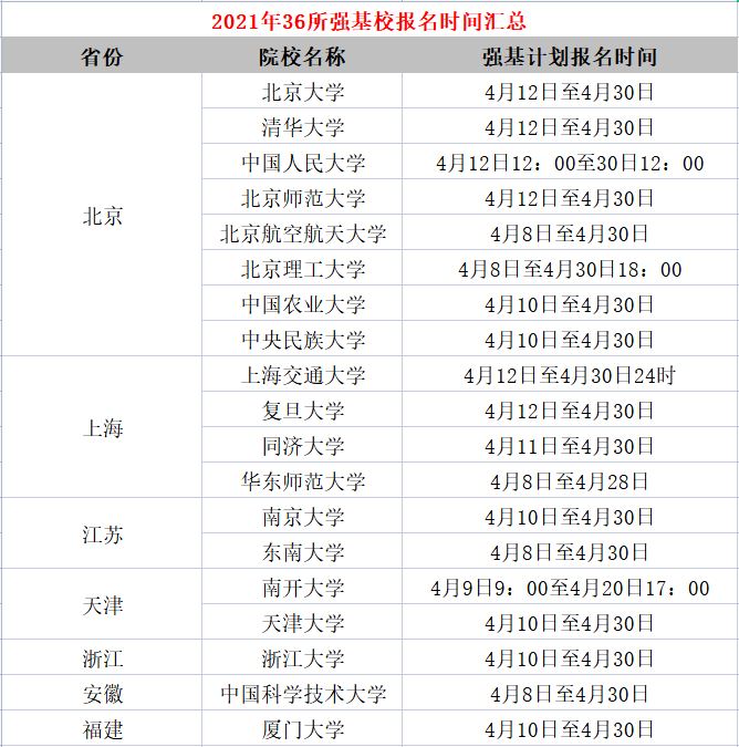根据往年情况,3月底至4月中上旬,36所强基计划试点高校将陆续发布本年度的强基计划招生简章。2021年北京理工大学简章率先发布,而清华大学、北京大学、上海交通大学、复旦大学4所牛校发布时间较晚。