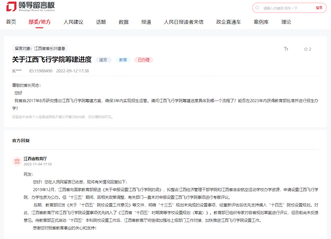 近日,有网友在人民网领导留言板咨询江西飞行学院筹建进度,官方回复称,江西省教育厅将江西飞行学院设置事项优先纳入了《江西省“十四五”时期高等学校设置规划(草案)》。待教育部正式启动“十四五”本科院校设置工作后,江西省教育厅将继续加强与上级部门工作对接,加快推进江西飞行学院设置工作。
