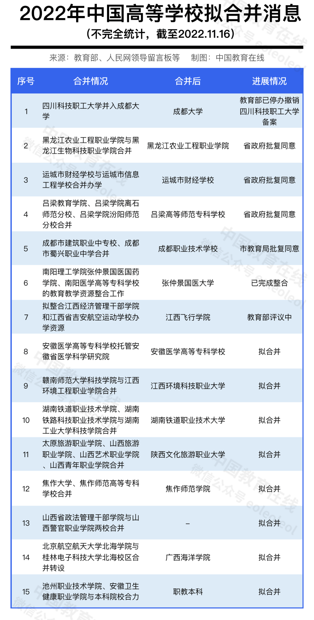 2022年有多所学校传出了要合并的消息,涉及到30多所高校,将合并成15所。