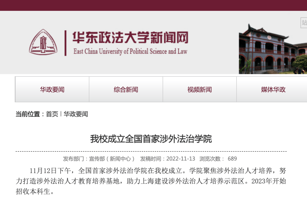 全国首家涉外法治学院——华东政法大学涉外法治学院日前成立,并将于2023年招收首届本科生。