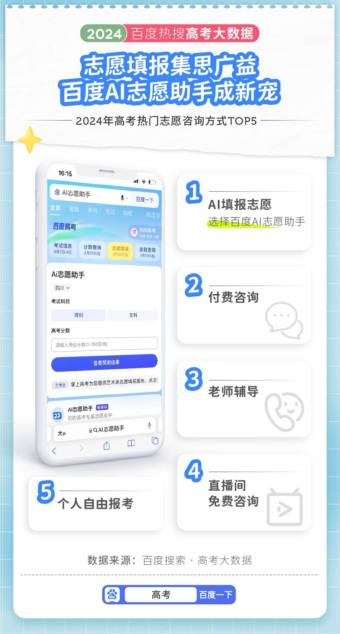 此外,报志愿「姿势」也五花八门,AI填志愿成新宠。据报道,仅6月25日一天,就有超过1000万用户使用了百度Ai志愿助手。