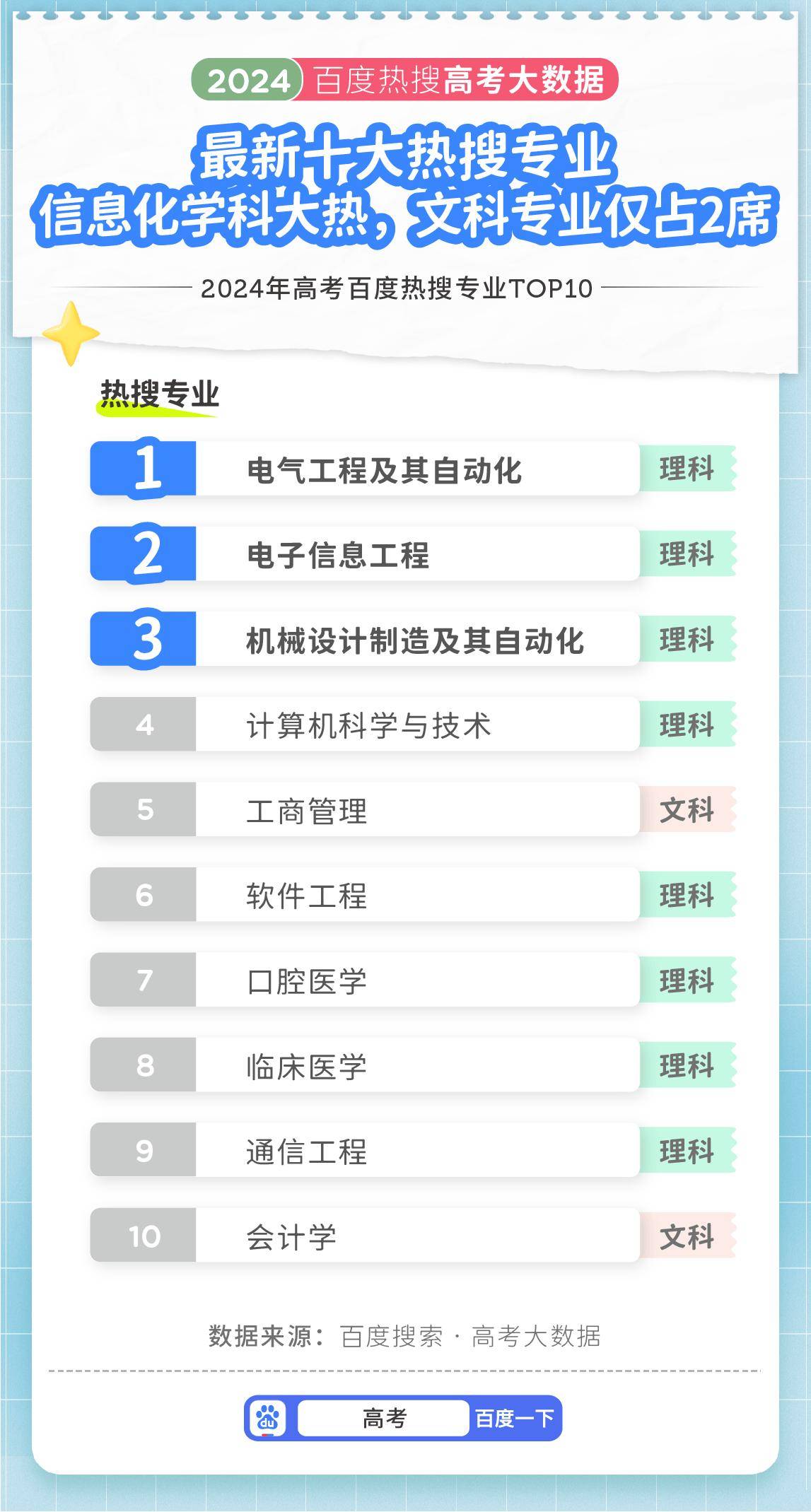 除了选择心仪的院校,选择报考的专业也是考生和家长关注的焦点。这个决定不仅关乎未来的职业道路,更承载着对个人兴趣、能力和长远发展的深思熟虑。在今年的十大热搜专业中,电气工程及其自动化、电子信息工程、计算机科学与技术、临床医学等计算机、信息化相关专业屠榜。前十热门专业中,文科仅有两席,工商管理排名第五,会计学排名第十。