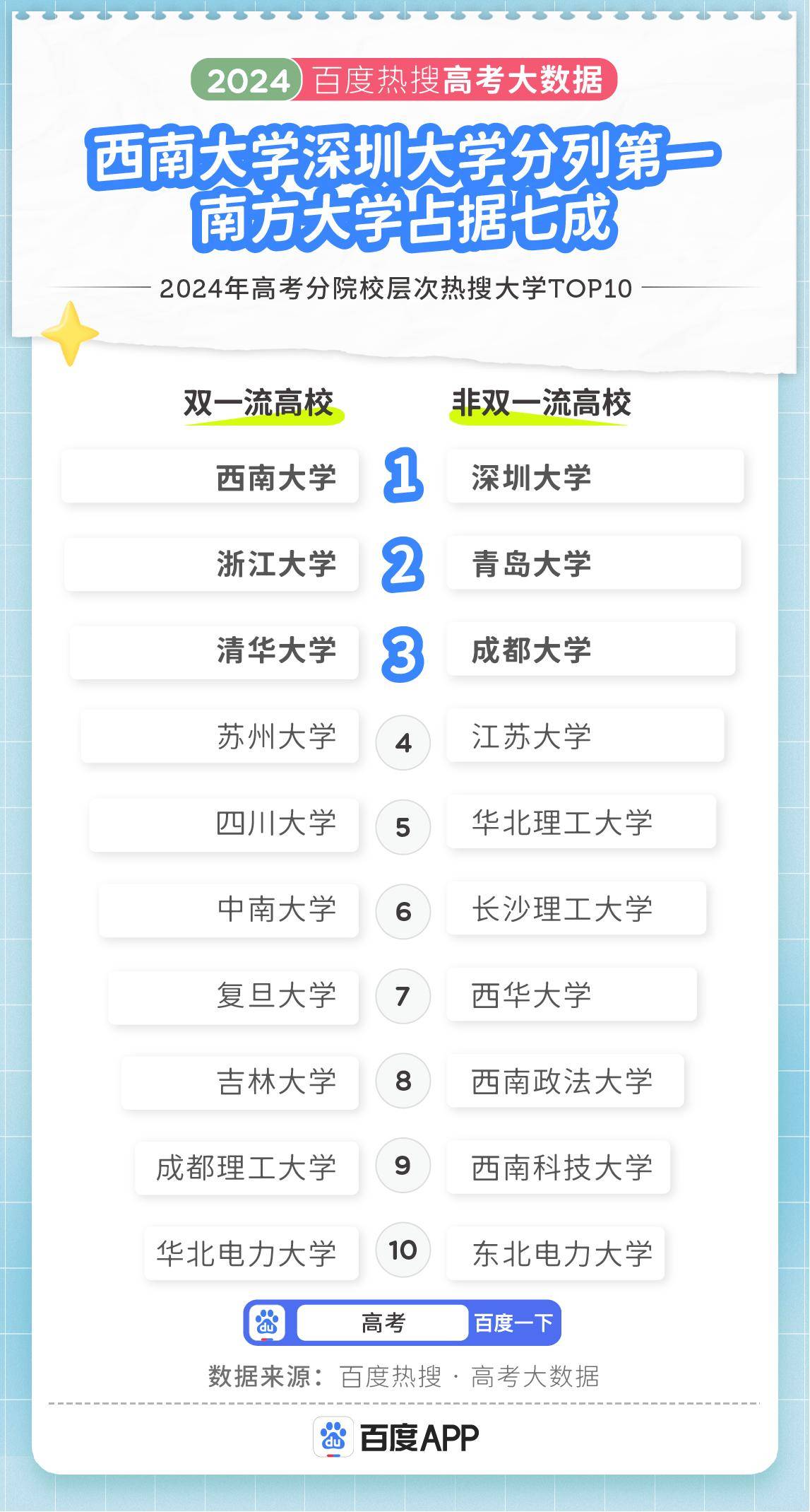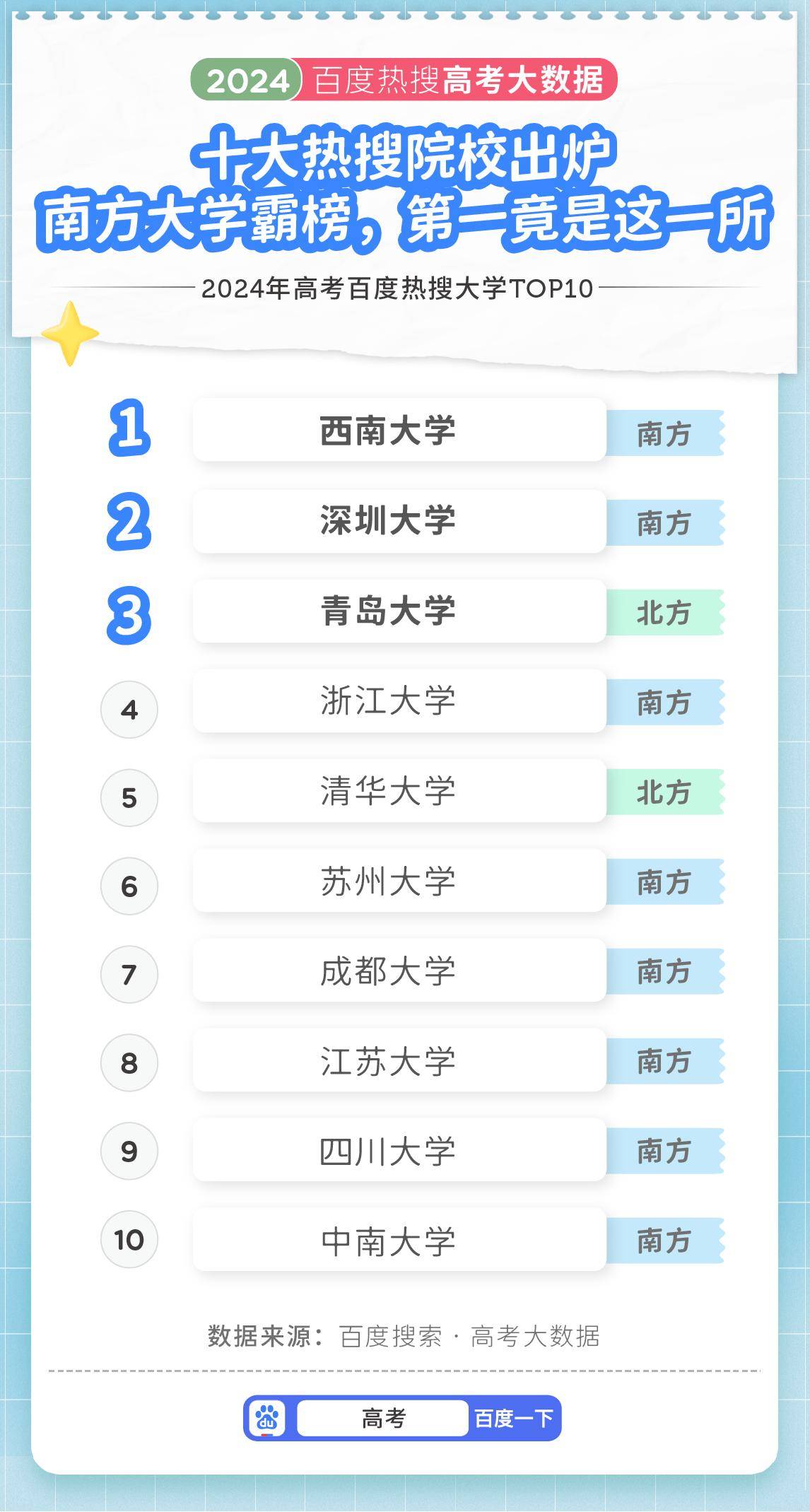 高考院校的选择始终是考生们心中最牵动神经的话题。大数据显示,2024年,最受搜索关注的十大热搜院校名单已出炉。西南大学出人意料地在热搜院校中拔得头筹,紧随其后地是深圳大学和青岛大学,值得一提的是,在热搜院校前十中,只有青岛大学和清华大学两座北方大学,其余8席尽归南方高校。