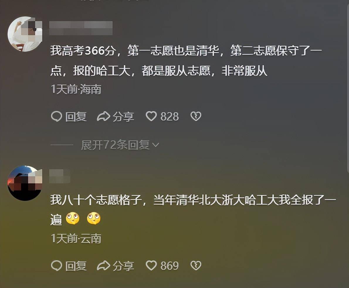 而有不少网友提起了自己的志愿填报,说自己当年考了366分,第一志愿也是清华,第二志愿是哈工大,都是服从调剂。还有网友说八十个志愿格子,当年清华、北大、浙大、哈工大全报了一遍……