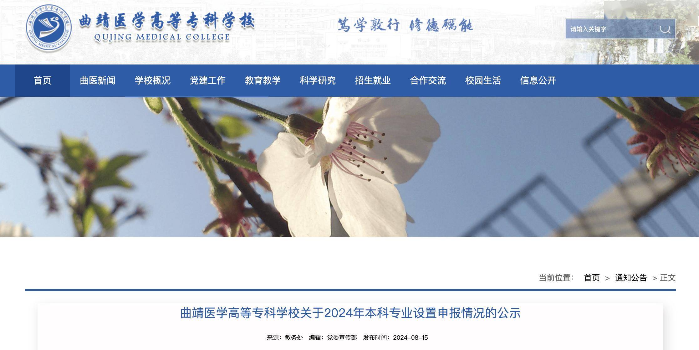 9月9日,云南省教育厅发布《关于拟申报设置有关高等学校的公示》。公示内容显示:经省高等学校设置评议委员会专家考察和评议,现对拟向教育部申报在曲靖医学高等专科学校基础上设立普通本科学校事项向社会公示。