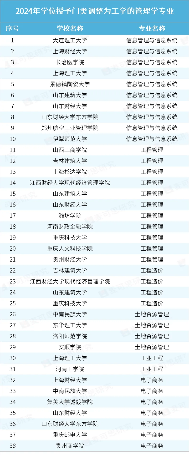 尤为值得注意的是,这些“转工”专业中又以放弃“管理学”的专业最多——包括31个“可授管理学或工学学位”的专业和7个“可授管理学或经济学或工学学位”的专业。其中,工程管理(11个)、信息管理与信息系统(10个)专业数量合计占半数。