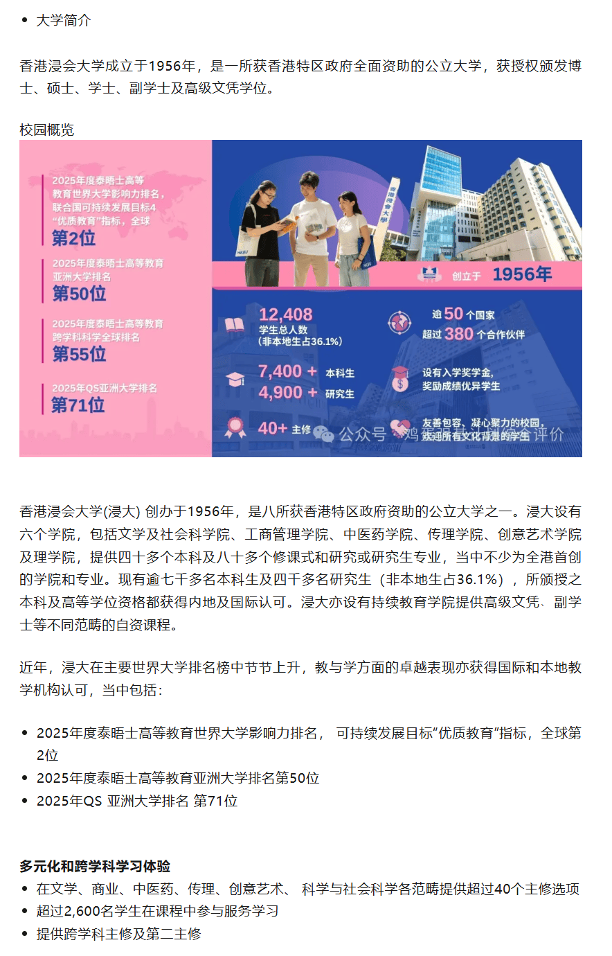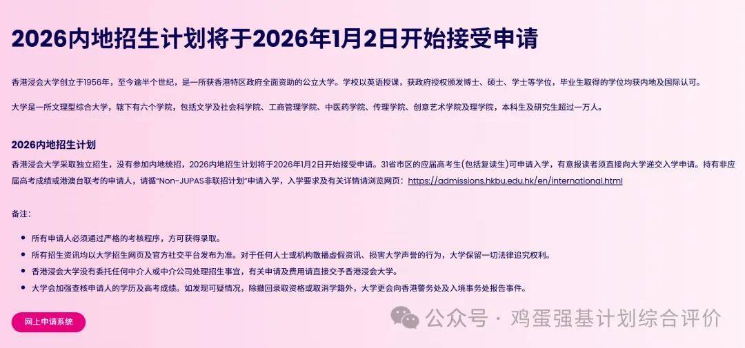 今日,香港浸会大学2026年内地本科招生简章在其官网上公布,其内地本科招生将于2026年1月2日开始接受申请!大大早于以往的年份,其中缘由耐人寻味。我们特整理了香港浸会大学的招生日程、招生计划、报名要求、申请方法申请流程、学费奖学金等完整招生信息,一起来看!