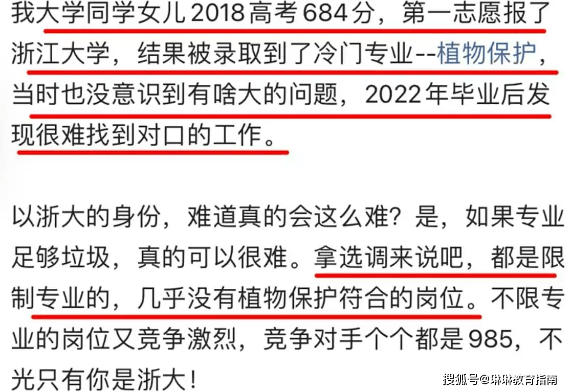 这名高考取得684分的考生,在毕业季节遭遇了严重的就业困境。尽管她手持"浙大"这张名校文凭,却发现适合自己专业的工作岗位寥寥无几,而这个让她后悔多考100分的专业,就是浙大的植物保护专业。