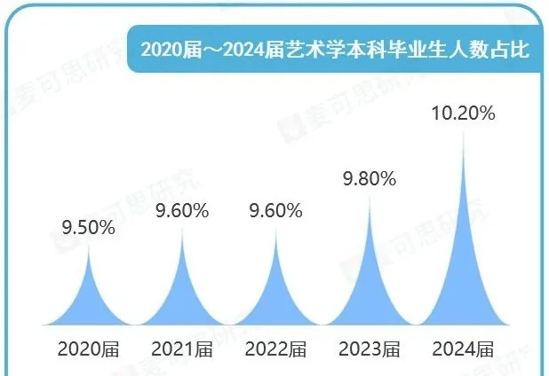 如今,艺术学已经成为应届本科毕业生第三大学科。根据国家统计局数据,2024届艺术学本科毕业生人数占比已稳步升至10.2%。