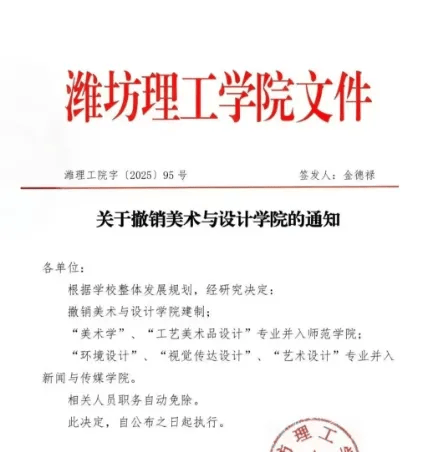 近日,有网友在社交媒体透露,10月的第一天,山东师范大学历山学院正式宣布撤销美术与设计学院建制,其5个专业分别并入师范学院、新闻与传媒学院,相关人员职务自动免除。