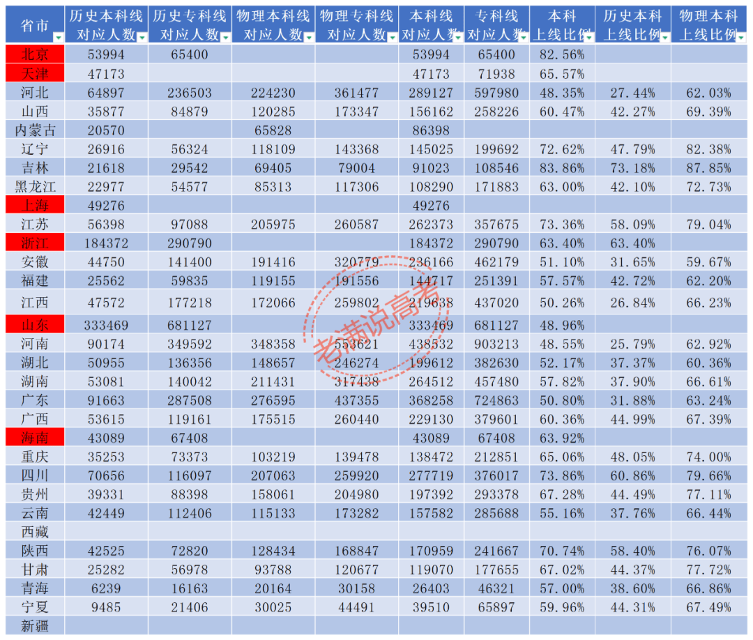表格里标红的北京、天津、河北、上海、浙江、山东、海南是新高考省份中不分物理和历史的,一条线搞定;没标红的则是新高考省份分物理和历史类别的,历史类和物理类分开划线,两者玩法有些不同: