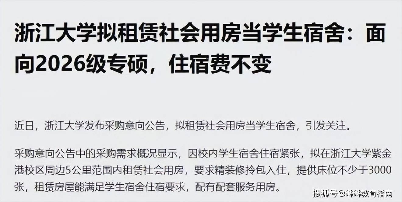 除此之外,还有一些高校会给同学提供过渡的空间,比如浙江大学,就明确表达了2026级全日制专业学位硕士研究生,在第一学年中,原则上由学校租用校外资源安排住宿,后续需自行解决。