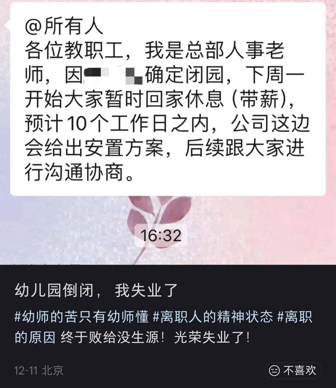 否则你正工作着呢,幼儿园可能就没了,现在这种大趋势下,民办幼儿园关停可太普遍了。
