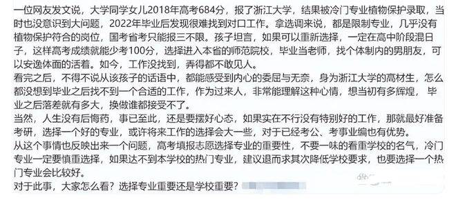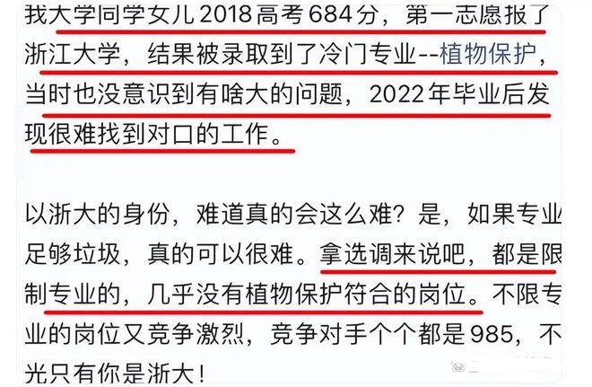 让我们把目光聚焦到这位女生的高考经历。当年高考时,她表现十分出色,取得了684分的优异成绩。这对于许多学生来说,已经是梦寐以求的分数。然而,在报考浙江大学时,情况却并不乐观。由于浙江大学是众多高分考生竞相追逐的目标,热门专业的竞争异常激烈。她的这个分数,虽然能够被浙江大学录取,却没有足够的优势去选择那些热门的、就业前景好的专业,只能无奈地等待学校的调剂结果。
