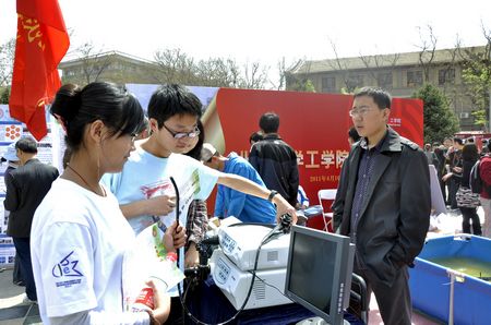 工学院各个专业、学科以及近年来发展成就的介绍。正在进行社团展示的机器人协会的展台恰好位于