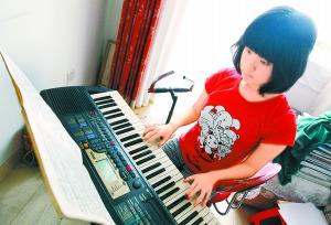 坐在家人制作的代步椅上,因先天成骨不全,从小不能走路的女孩方璇正在弹奏着她日常非常喜欢的电子琴