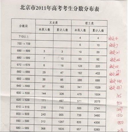 2011年北京市与海淀区高考考生分数分布表(网传版)