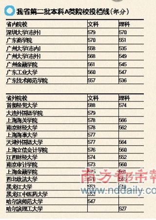 省内高校方面,生源同样“火爆”,除个别学校以外,绝大多数院校都能投“满档”,且投档线“飙高”。如深圳大学市外生源文科投档线为579分,仅比一本线低1分,市外理科投档线为570,比一本线还高出2分,文理科分别高出二本省线43分和66分。广东商学院文科投档线为570分,理科为551分,比二本省控制线分别高出34分和47分。广州大学市外生源文科投档线为568分,理科为549分,亦高出二本省控制线28分和45分。