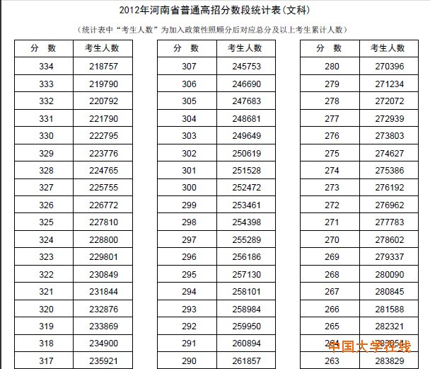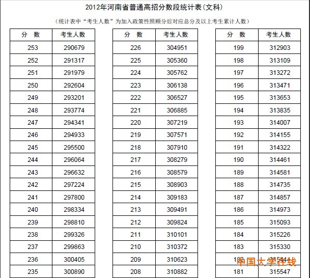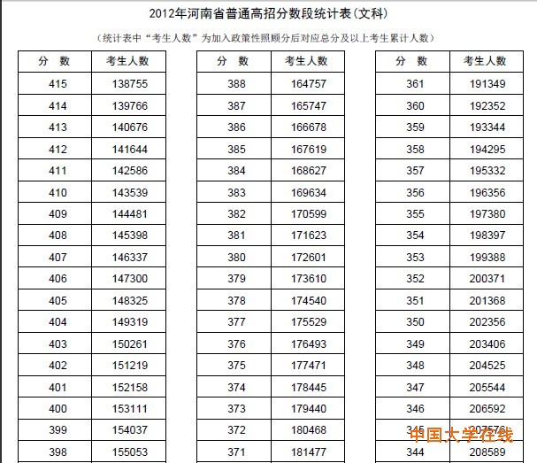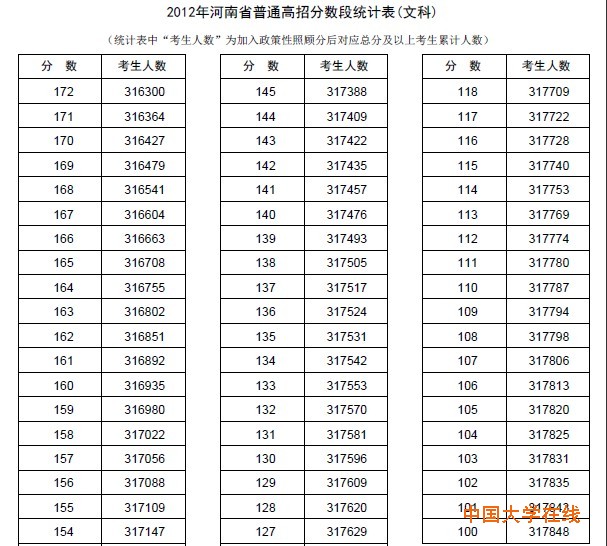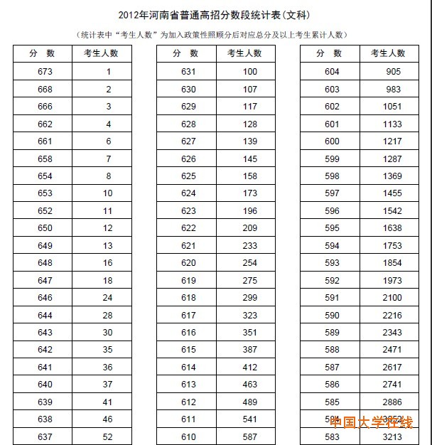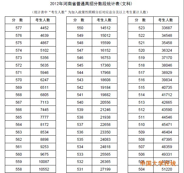 2012年河南省普通高招录取控制分数线已公布,文科一本分数线为557分,二本线509分,三本线447分,专科一批线360分。新增的专项计划本科批分数线为557分,专项计划专科批分数线为360分。理科一本分数线为540分,二本线481分,三本线391分,专科一批线300分。新增的专项计划本科批分数线为540分,专项计划专科分数线为300分。以下是河南2012高考分数段统计表(文科)