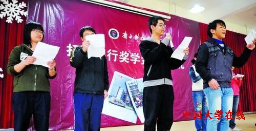 在紧张的“备考”氛围中,昨日南科大因另一件事情而充满喜庆:学校召开首项奖学金———“招商银行奖学金”的颁奖仪式。该奖金总额10万元,由招商银行提供,奖励对象为首届教改实验班中各科单科成绩第一名(体育除外)和总分排名前30%的同学。根据奖项设置情况,南科大今年开设的科目除了理科的线性代数、计算机科学、物理等,也有比较现代学、国学经典、社会学导论等人文社科课程。颁奖现场,深圳学子、13岁的王嘉乐和14岁的范紫藜多次走上台,从南方科技大学校长朱清时和招商银行行长马蔚华手中接过奖状。这两名毕业于深圳耀华实验学校的“超常生”,除了一等奖学金,还捧回多个单科奖项。