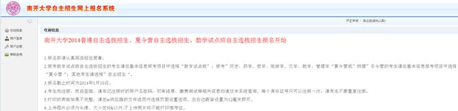 1. 登陆南开大学本科招生网(http://zsb.nankai.edu.cn/)阅读自主招生办法 2. 登陆南开大学自主招生报名系统(http://zhshb.nankai.edu.cn)报名 3. 准备一张电子版证件照(照片规格大小不超过50k,格式jpg,尺寸100像素*120像素) 4. 仔细阅读欢迎信息:注意截止时间5. 点击用户注册,依次填写各项信息,牢记注册的用户名和密码,一个身份证号只能注册一次