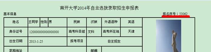 18. 整理好所有申请材料(包括报名表、公能陈述表、相关证书或证明复印件等),寄送材料至南开大学招生办公室,地址:天津市南开区卫津路94号,电话022-23504845,邮编300071 19. 进入自主招生网上报名系统,右边查看审核结果中,可以查看您的纸质介质是否已收到(如果快递回复您收到了,报名系统还没有显示,请您等待一两天,因为数据录入需要一定时间)及初审结果20. 等待审核结果