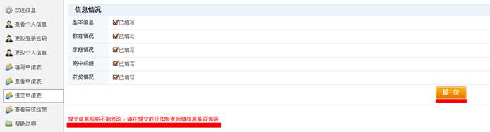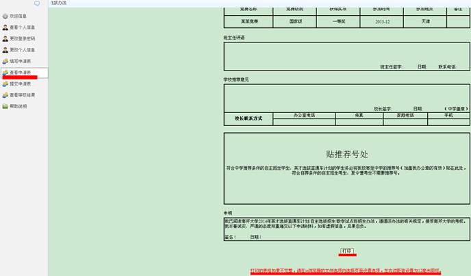 15. 信息核对无误后,点击左侧提交申请表提交申请,提交后不允许修改,请务必确认确实无误后再提交申请16. 打印申请表时请点击左边查看申请表,然后点击页面下方打印申请表,打印表格请必须用ie浏览器在文件选项内将页面设置选项左右边距设为12mm才能打印完整