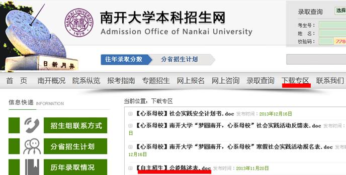 17. 打印申请表后,从南开大学本科招生网(http://zsb.nankai.edu.cn/)下载专区下载《公能陈述表》填写