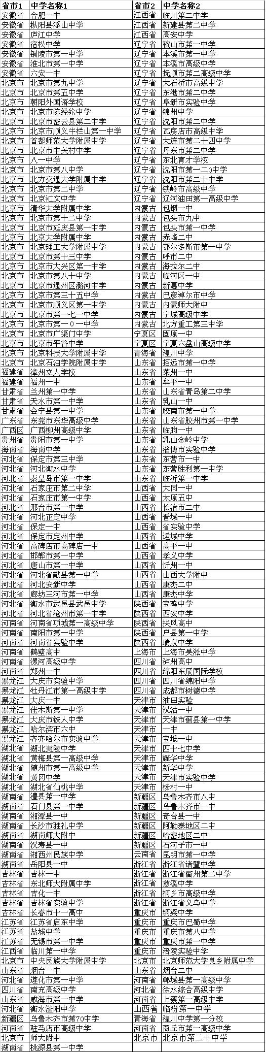 注:中学名单分为两列,按省份字母表由上到下排序