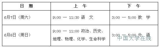各科目的具体考试时间安排如下:6月7日上午9:00-11:30语文,下午3:00-5:00数学;6月8日上午9:00-11:00政治、历史、地理、物理、化学、生命科学,下午3:00-5:00外语。
