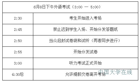 据了解,为确保普通高校招生外语听力考试的顺利进行,6月8日下午2:30考生开始进入考场,2:45后禁止迟到学生入场,3:00听力考试正式开始。